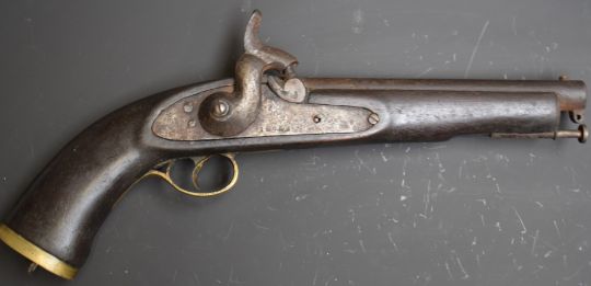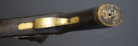 Enfield pattern percussion hammer action pistol with East India Company lion and '1810' stamped to the lock, brass trigger guard and mounts, steel ram-rod, belt loop and 7.5 inch smooth bored barrel, overall length 37.5cm.