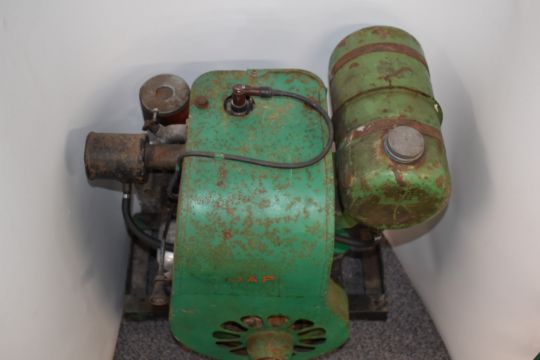 J.A.P model 5 stationary engine which the vendor advises it is in running condition, on four wheel trolley or skate, height 63cm