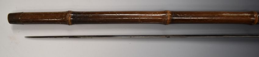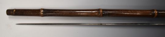 Thomas Brigg & Sons swordstick with 74cm thickened diamond blade engraved 'T Brigg & Sons 23 St James St SW', bamboo handle and scabbard and hallmarked silver collar, overall length 94.5cm. PLEASE NOTE ALL BLADED ITEMS ARE SUBJECT TO OVER 18 CHECK ON COLLECTION OR DELIVERY