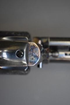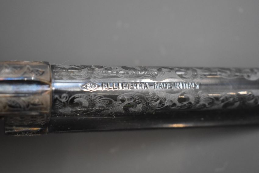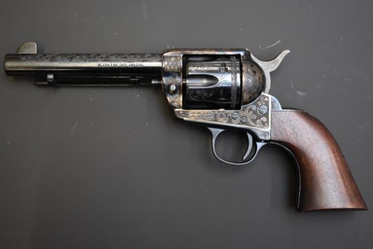Pietta Colt Peacemaker 1873 style .44 blank firing six-shot single-action revolver with ornately engraved frame, cylinder and 5.5 inch barrel and shaped wooden grips, overall length 30cm, serial number E46876.
