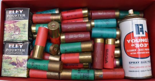 Over 200 12 bore and .410 shotgun cartridges including Lyalvale Express Pigeon Special and High Velocity Competition, Eley Fourten etc together with a leather cartridge belt, cleaning kit etc. PLEASE NOTE THAT A VALID RELEVANT FIREARMS/SHOTGUN CERTIFICATE IS REQUIRED TO HANDLE/PURCHASE THIS ITEM. WE ARE NOT ABLE TO OFFER OUR USUAL POSTAGE SERVICE FOR THIS LOT.