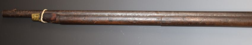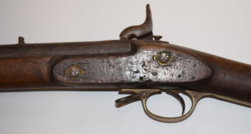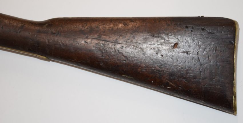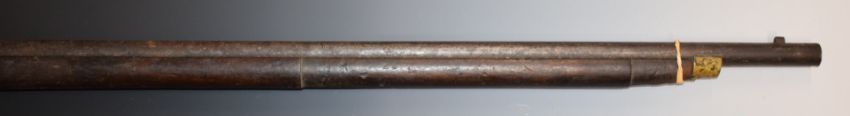 Enfield three band 20 bore percussion hammer action gun with lock stamped with crown over 'VR' cypher and '1864 Enfield', brass trigger guard, butt plate and mounts, sling suspension loop and 39 inch barrel, overall length 140cm.
