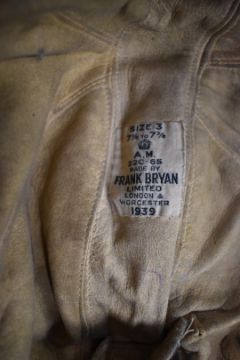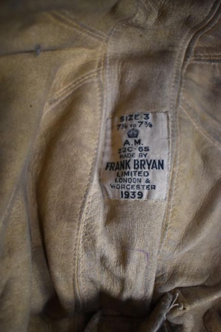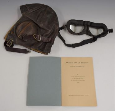 WW2 British Air Ministry leather flying helmet by Frank Bryan Ltd, model 22C-65 dated 1939, size 3 7⅛ to 7⅜, together with a pair of flying goggles and an Air Ministry publication 'The Battle of Britain'