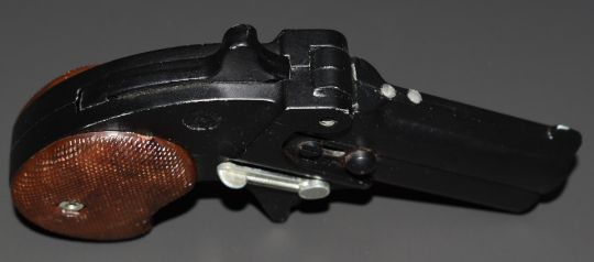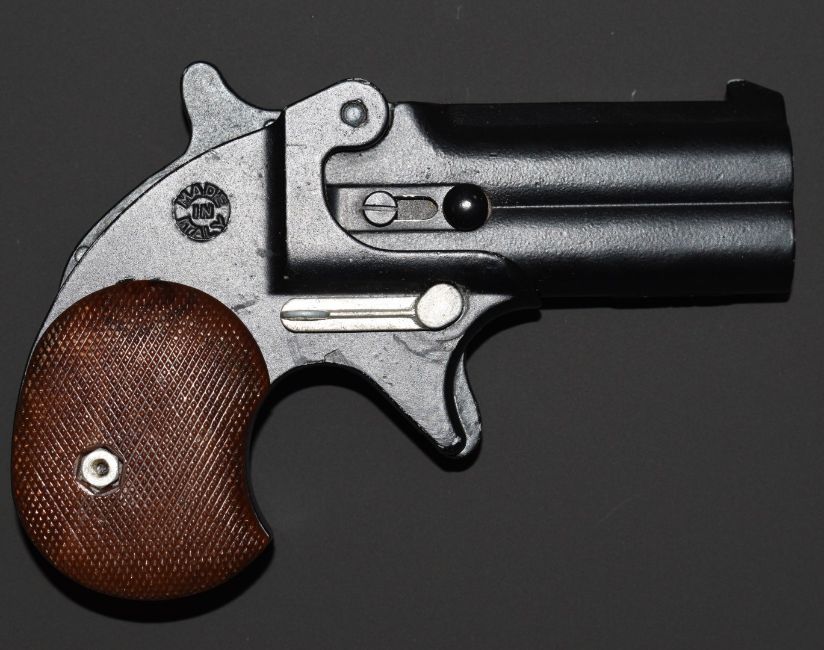 Italian .36 blank firing over and under Derringer pistol with chequered grips, sheath trigger and 3 inch barrels, overall length 13.5cm.