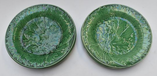 Twelve Majolica plates including Wedgwood