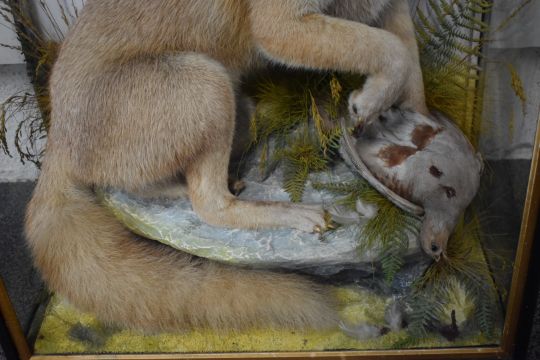 Edwardian J Hutchings of Aberystwyth taxidermy study of a fox with grey partridge prey in naturalistic setting, in glazed case, W61 x D32 x H79cm