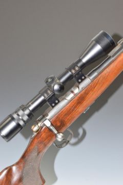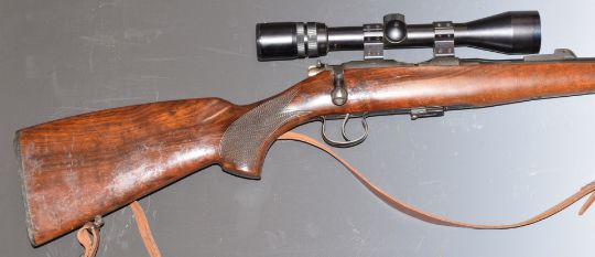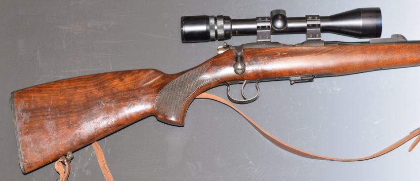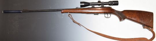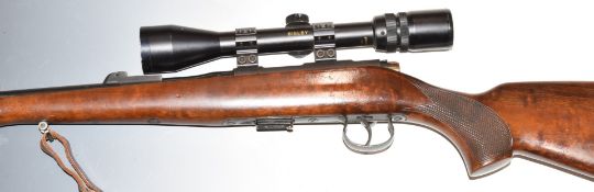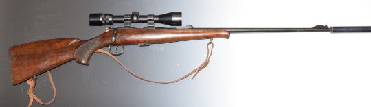 BRNO Model 2-E .22 bolt-action rifle with chequered semi-pistol grip, magazine, leather sling, Bisley 3-9x40 scope, sound moderator and 25 inch barrel, overall length 126cm, serial number 379916. PLEASE NOTE THAT A VALID RELEVANT FIREARMS/SHOTGUN CERTIFICATE IS REQUIRED TO HANDLE/PURCHASE THIS ITEM.