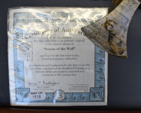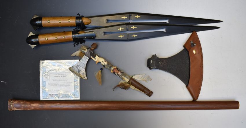 Two display swords, both with 50cm blades, replica throwing axe with cover and a 'Season of the Wolf' tomahawk. PLEASE NOTE ALL BLADED ITEMS ARE SUBJECT TO OVER 18 CHECK ON COLLECTION OR DELIVERY