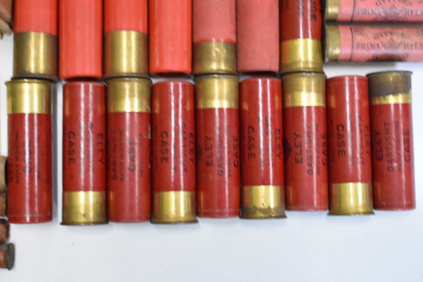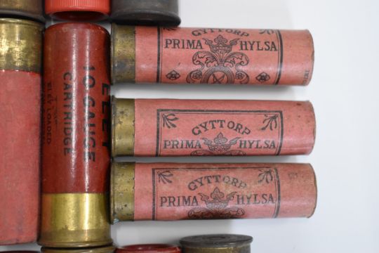 Thirty-three collectable paper cased shotgun cartridges and cartridge cases including twenty-five Eley Gastight 10 bore in original box, three Gyttorp 16 bore and four Eley .410. PLEASE NOTE THAT A VALID RELEVANT FIREARMS/SHOTGUN CERTIFICATE IS REQUIRED TO HANDLE/PURCHASE THIS ITEM. WE ARE NOT ABLE TO OFFER OUR USUAL POSTAGE SERVICE FOR THIS LOT.