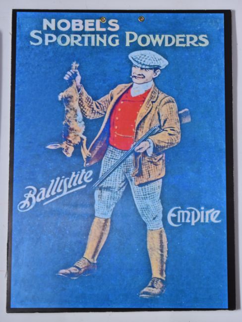 Three modern Nobel's shotgun cartridge shop display or advertising boards Nobel's Kingsway and two Nobel's Sporting Powders, largest 40x29.5cm.
