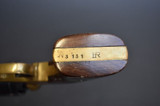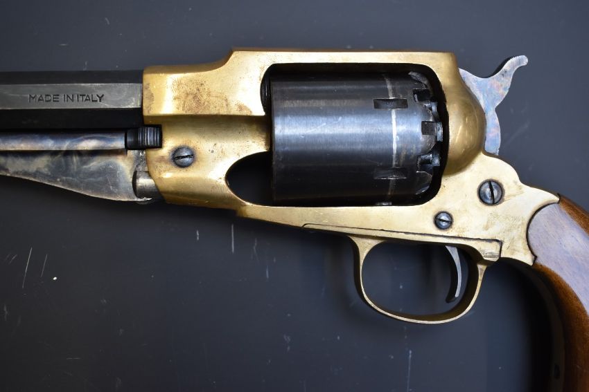 Italian .44 six-shot single action revolver with brass frame, shaped wooden grips and 7.75 inch octagonal barrel, overall length 36cm, serial number N3131. PLEASE NOTE THAT A VALID RELEVANT FIREARMS/SHOTGUN CERTIFICATE IS REQUIRED TO HANDLE/PURCHASE THIS ITEM.