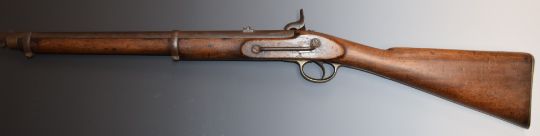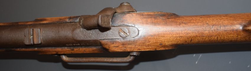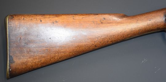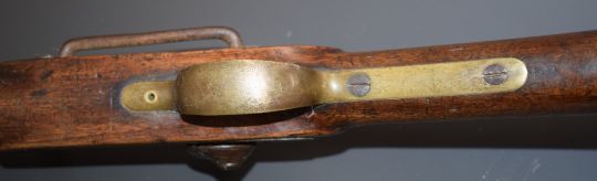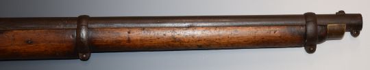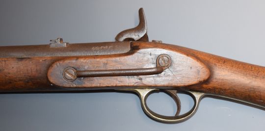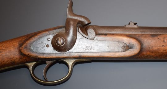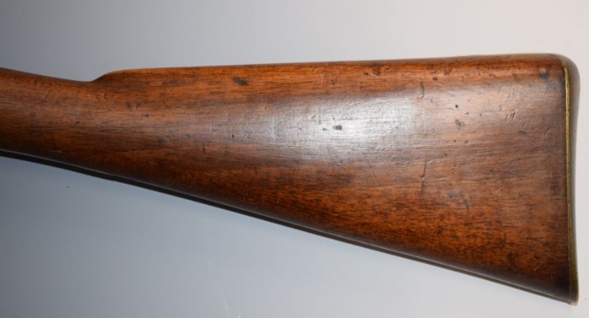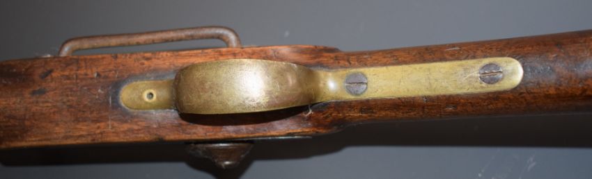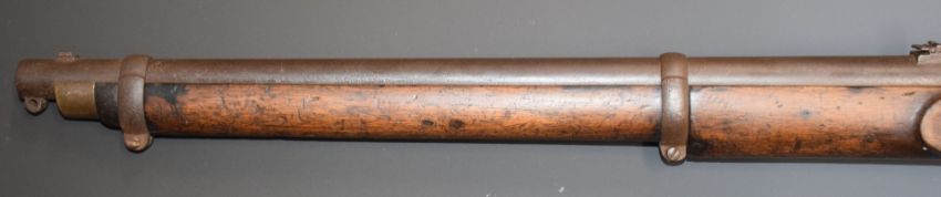 Enfield two band percussion hammer action Cavalry carbine rifle with lock stamped '1857 Tower' and with crown over 'VR' cypher, brass trigger guard, butt plate and mounts, sling rail and 21 inch barrel, overall length 93cm.