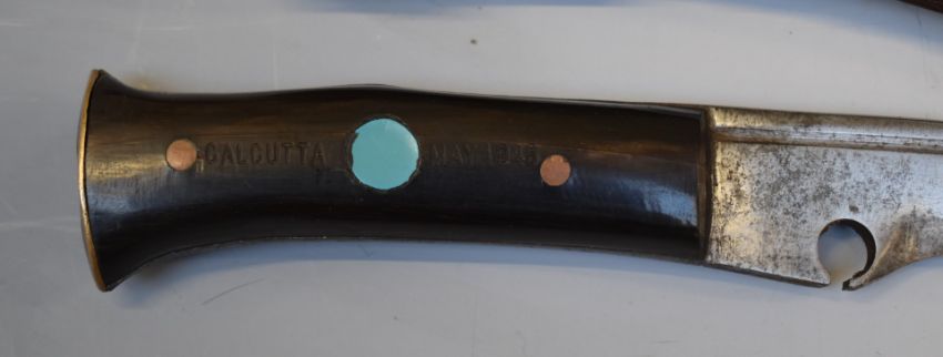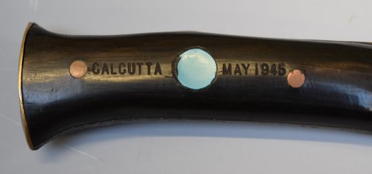 WW2 kukri knife engraved Calcutta May 1945 to the handle, with 19cm blade and sheath. PLEASE NOTE ALL BLADED ITEMS ARE SUBJECT TO OVER 18 CHECK ON COLLECTION OR DELIVERY