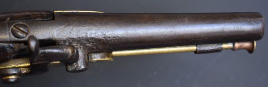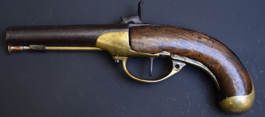 Manbeuge French percussion converted from flintlock hammer action service pistol with named brass lock stamped 'B387T', brass trigger guard and ram-rod, steel hammer and 5.5 inch smooth bored steel barrel, overall length 31.5cm.