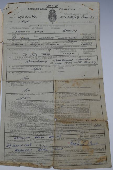 Auxiliary Territorial Service (ATS) side hat attributed to Kathleen Beryl Brown, with associated documentation including Soldier's Service & Pay book, Certificate of Service, cloth badges etc