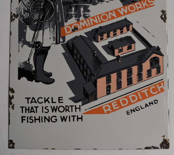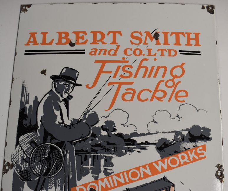 Albert Smith and Co Ltd, Dominion Works, Redditch, England enamel shop display or advertising sign 'Fishing Tackle - Tackle That Is Worth Fishing With', 51x30.5cm