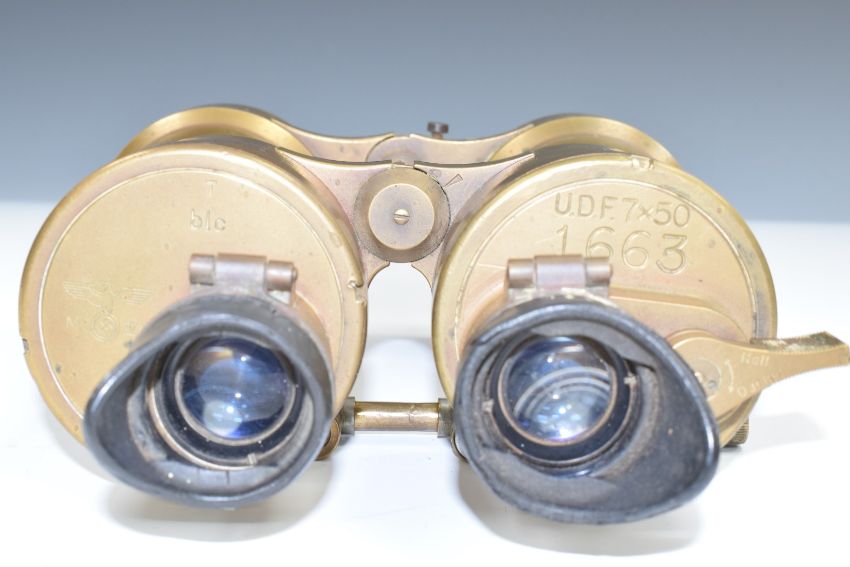 WW2 German Nazi U boat binoculars marked UDF 7x50 1663 T blc and with eagle and swastika with M IV /1 below, serial number 214677