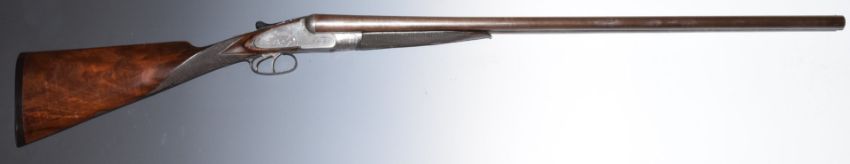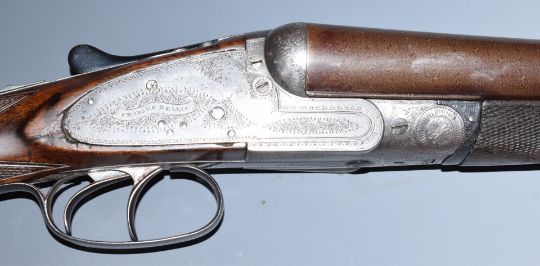 Charles Hellis 12 bore side by side sidelock ejector shotgun with named and engraved locks, scrolling engraving to the underside, trigger guard, top plate and thumb lever, chequered grip and horn tipped forend, vacant cartouche to the underside of the stock, double trigger and 30 inch Damascus barrels choked ¼ and ¾, overall length 119cm, length of pull 36.5cm, serial number 530. PLEASE NOTE THAT A VALID RELEVANT FIREARMS/SHOTGUN CERTIFICATE IS REQUIRED TO HANDLE/PURCHASE THIS ITEM.