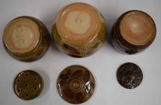 Three Royal Doulton Foliage Ware tobacco jars / pot pourri decorated in the Autumn Leaves pattern, tallest 13cm