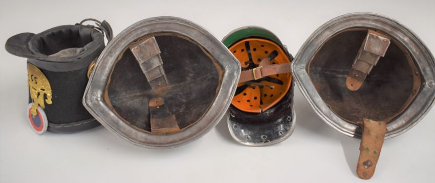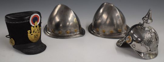 Four miniature military helmets, comprising French shako for 59th Regiment, Prussian pickelhaube and two conquistador style examples