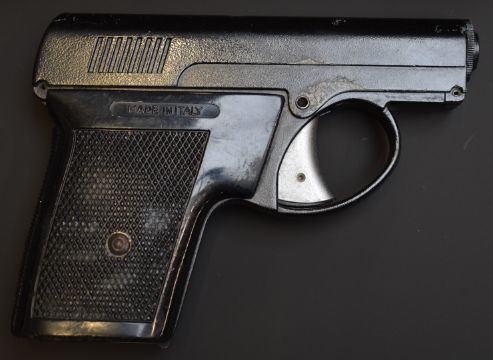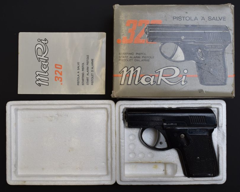 Ma Ri Italian .320 blank firing starting pistol with chequered grips and five shot magazine, in original box with instructions.