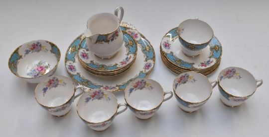 Twenty one pieces of Shelley tea ware decorated in the Blue Empress pattern, includes six trios.