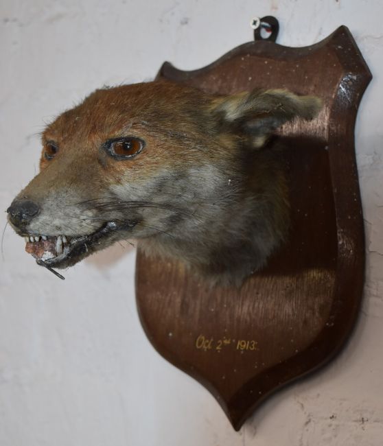 Taxidermy fox mask study mounted on a wooden plinth, dated 1913, H31cm