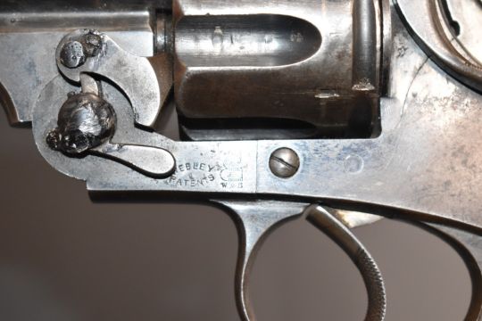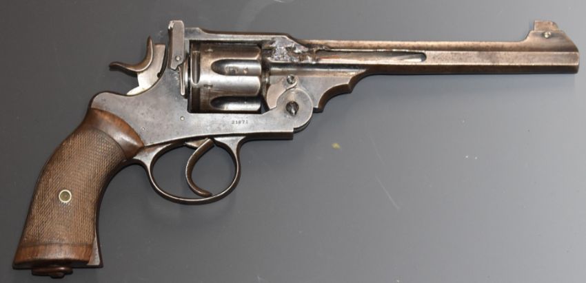 Deactivated British Webley WG Target Model .450 six-shot double action revolver with chequered wooden grips, belt loop and 7.5 inch barrel, overall length 37cm, serial number 21871, with deactivation certificate dated 12/05/21.