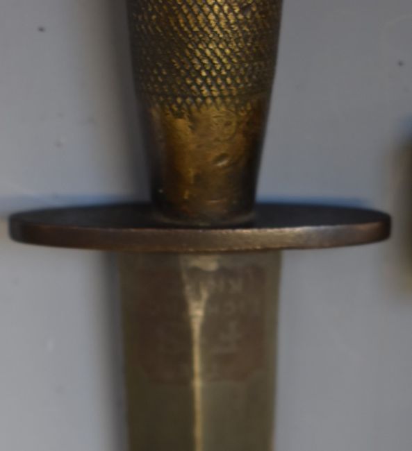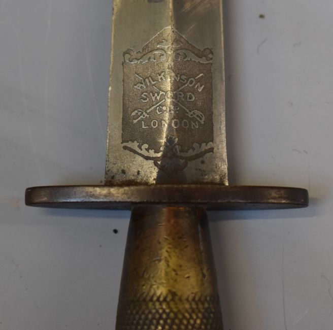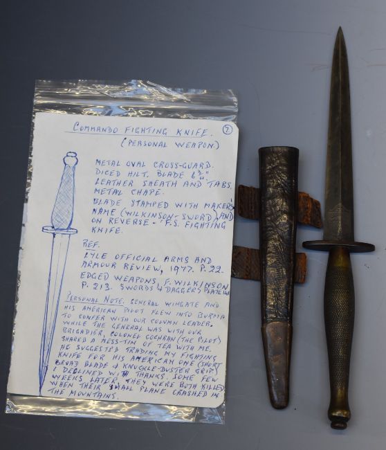 British Army WW2 Fairbairn Sykes fighting knife attributed attributed to Chindit Sgt W B Wilkinson Royal Engineers, diced hilt and Wilkinson Sword of London makers and F S fighting knife to 17cm blade together with leather sheath and a handwritten note from Sgt Wilkinson telling of when Colonel Cochran (General Wingate's pilot) offered his knife and knuckleduster in a swap for the knife. PLEASE NOTE ALL BLADED ITEMS ARE SUBJECT TO OVER 18 CHECK ON COLLECTION OR DELIVERY