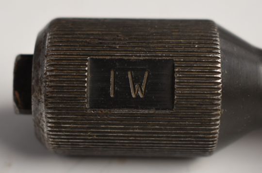 A metal blank firing adaptor or attachment stamped IW.