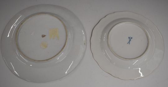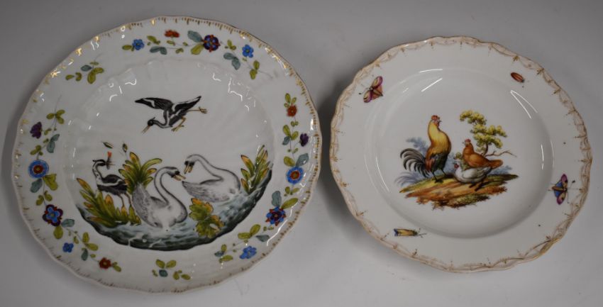 Meissen cabinet plate decorated with fowl and a continental cabinet plate with relief moulded decoration of swans and herons, largest 23cm diameter