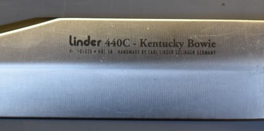 Linder 440C Kentucky Bowie knife number 101020, the 20cm blade inscribed 'Handmade by Carl Linden Solgen Germany', with sheath. PLEASE NOTE ALL BLADED ITEMS ARE SUBJECT TO OVER 18 CHECK ON COLLECTION OR DELIVERY