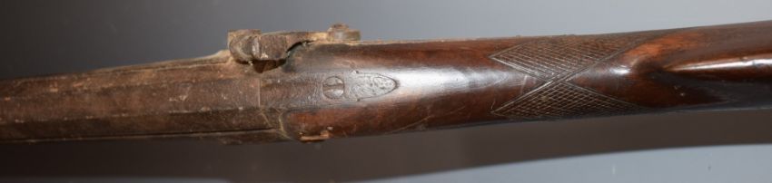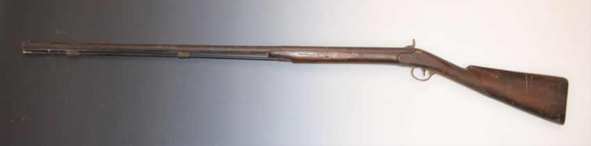 Unnamed 10 bore percussion hammer action sporting gun with engraved lock, chequered grip, brass tipped ram-rod and 39 inc smooth bore barrel, overall length 142cm.
