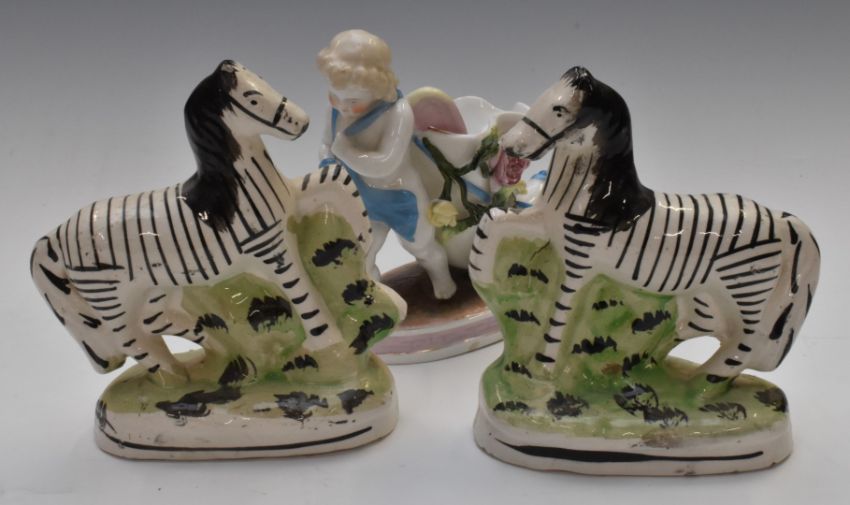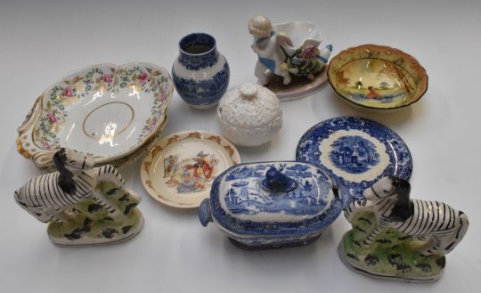Staffordshire pair of zebra, Copeland Italian pattern ceramics, Coalport, Royal Doulton, Derby dish etc., tallest 15cm