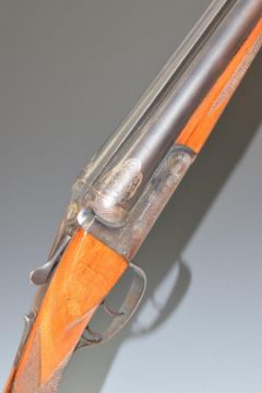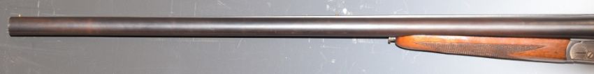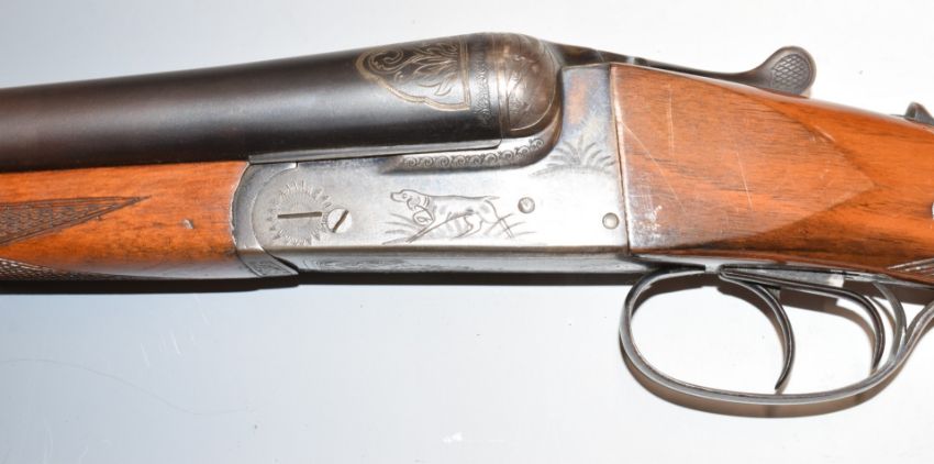 Essex 12 bore side by side shotgun with engraved scenes of dogs to the locks, engraved underside, trigger guard, fences, top plate and gold named thumb lever, chequered grip and forend, double trigger and 26.25 inch barrels, overall length 109.5cm, length of pull 36.5cm, serial number 108901. PLEASE NOTE THAT A VALID RELEVANT FIREARMS/SHOTGUN CERTIFICATE IS REQUIRED TO HANDLE/PURCHASE THIS ITEM.