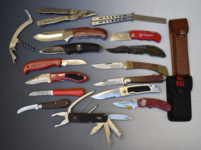 Twelve various pocket knives including Kasu, Taylors Eye etc, longest blade 9.5cm and five multitools including a Mammut Fine Tool Corporation example. PLEASE NOTE ALL BLADED ITEMS ARE SUBJECT TO OVER 18 CHECK ON COLLECTION OR DELIVERY