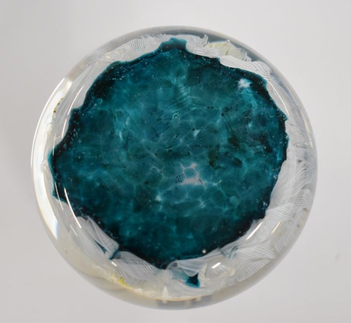 Perthshire millefiori glass paperweight with twelve canes including silhouette canes with a penguin, sailing boat etc., one dated 1975, 70mm in diameter.