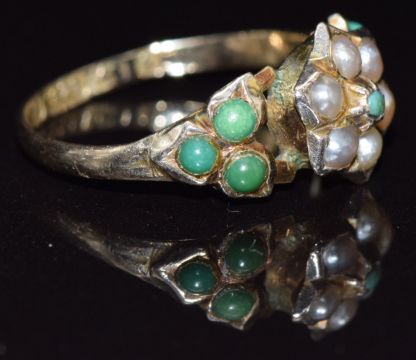 Victorian 9ct gold ring set with turquoise and seed pearls, to the underside a small glass compartment, Birmingham 1874, size K, 1.5g