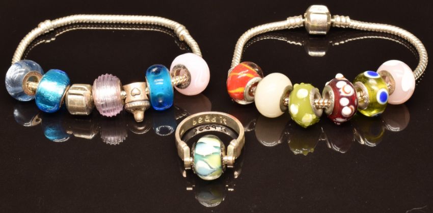 Two silver charm bracelets with glass bead charms