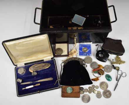 Cased hallmarked silver mounted manicure set, pair of thimbles marked sterling, purse with continental white metal mount and collectables to include commemorative and other coins (small silver content), Asprey folding opera or sports glasses etc