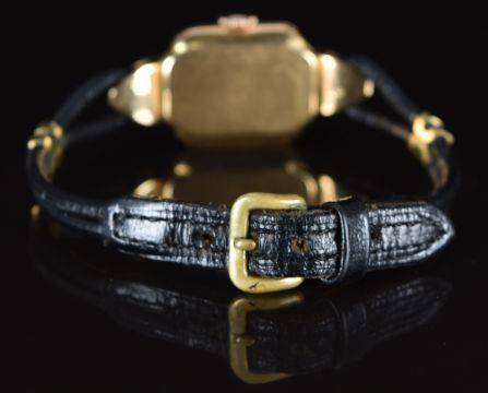 Suter Art Deco style 18ct gold ladies wristwatch with gold hands and hour markers, silver dial and Swiss movement, on black leather strap, case diameter 18mm.