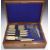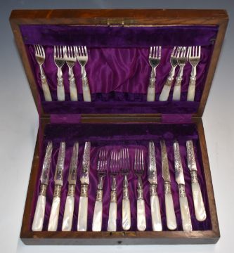 Six place setting canteen of silver plated cutlery, width of Oak canteen 47cm, together with a smaller case containing mother of pearl handled knives and forks with hallmarked silver ferrules, width 32cm