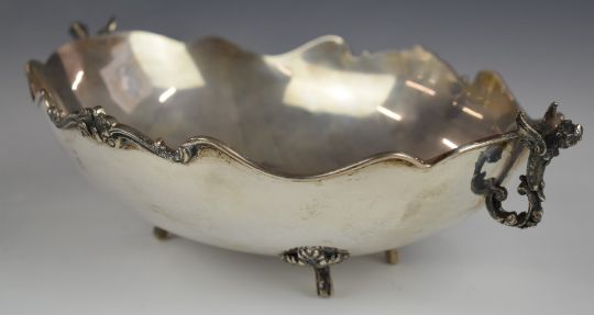 Continental white metal oval bowl with winged cherub handles, raised on four feet, marked 800 to underside, length 29cm, weight 454g
