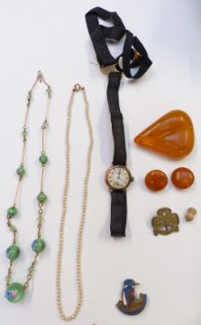 A collection of costume jewellery including silver brooch, Art Deco beaded necklace, 9ct gold J.W.Benson watch, Art Deco 9ct gold letter bracelet, vintage boxes, butterfly wing brooch, etc