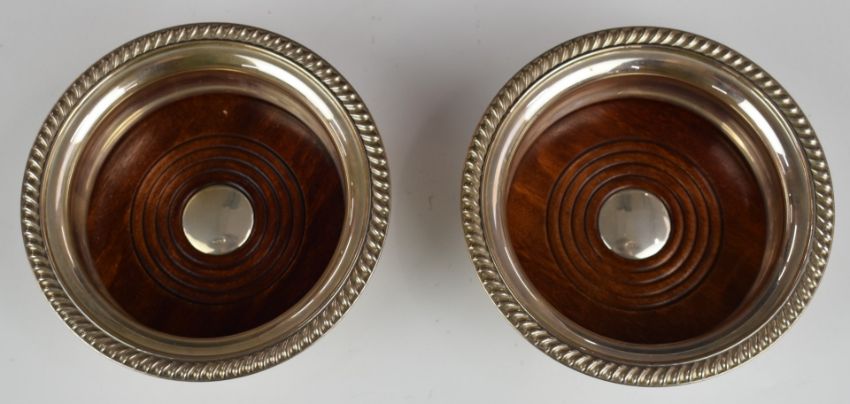 Modern pair of hallmarked silver wine coasters, Birmingham 2001, maker Barker Ellis Silver Co, diameter 14.5cm