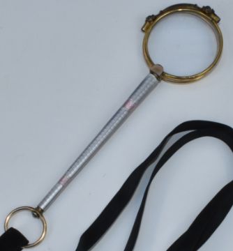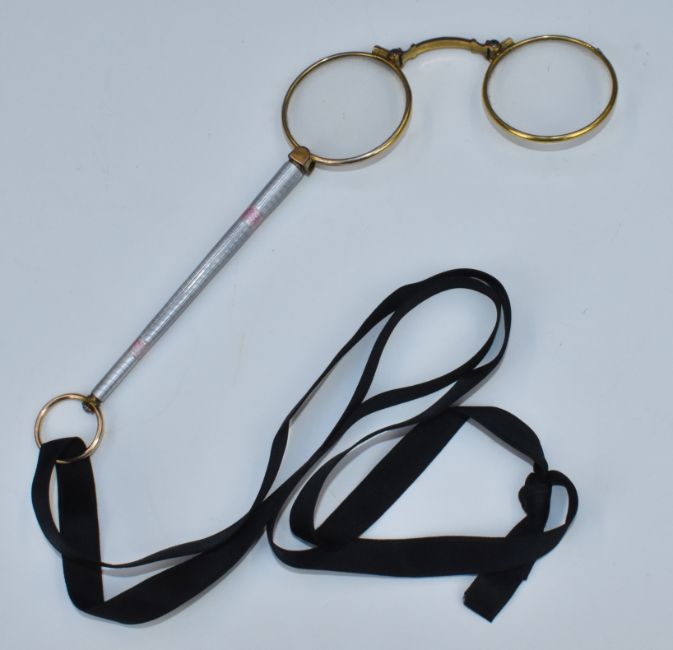 Art Deco lorgnettes with pink and blue guilloche enamel handle, length 16cm