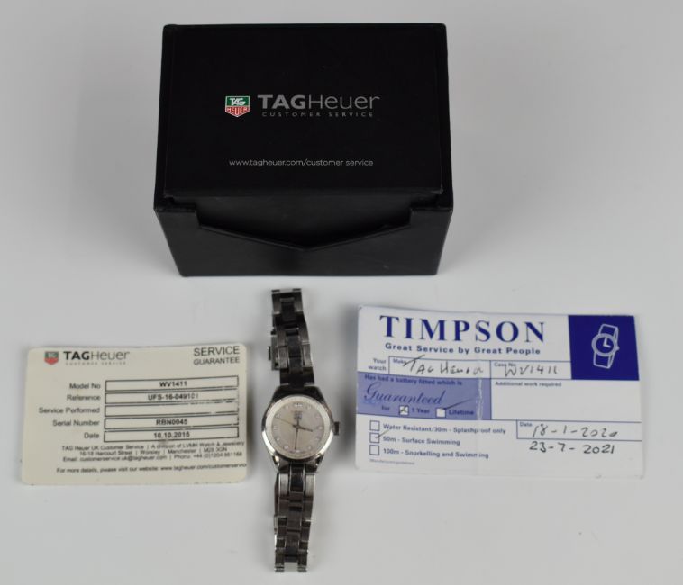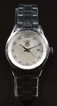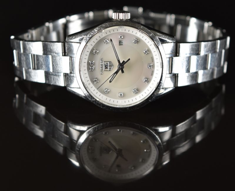 Tag Heuer Carrera ladies wristwatch ref. WV1411 with date aperture, luminous hands, diamond hour markers, pearl dial, stainless steel case and quartz movement, on stainless steel bracelet, case diameter 27mm, serial number UFS-16-049101, in original box with service guarantee card.
