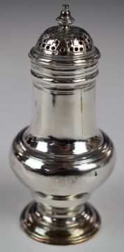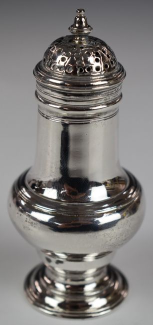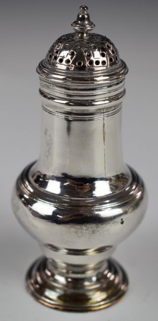 Georgian hallmarked silver pepper, London 1743, maker David Field, height 10.5cm, weight 69g