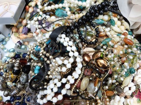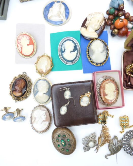 A large collection of costume jewellery including vintage brooches, amethyst and pearl necklace, necklaces, brooches etc