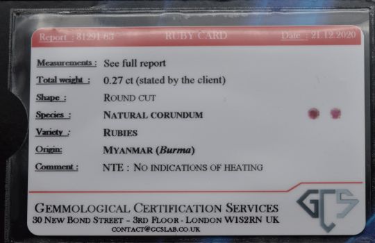 A pair of 18ct gold earrings set with natural unheated Burmese rubies (total 0.27cts), with GCS certificate